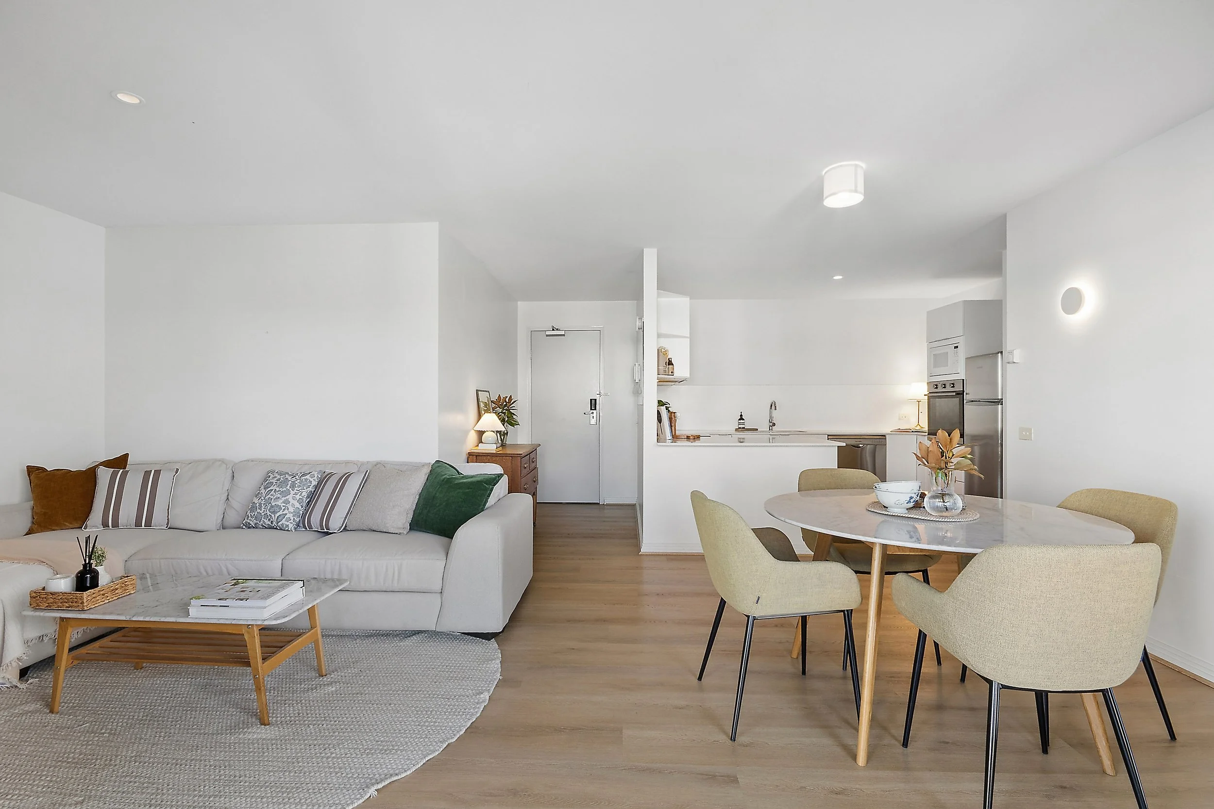 A modern palette and acoustic hybrid flooring set the tone, while large floor-to-ceiling windows fill the living and dining spaces with natural light. The renovated kitchen is finished with a striking stone waterfall benchtop, new dishwasher, brushed gunmetal sink and tapware, and a clever LED solar skylight that adds additional light.