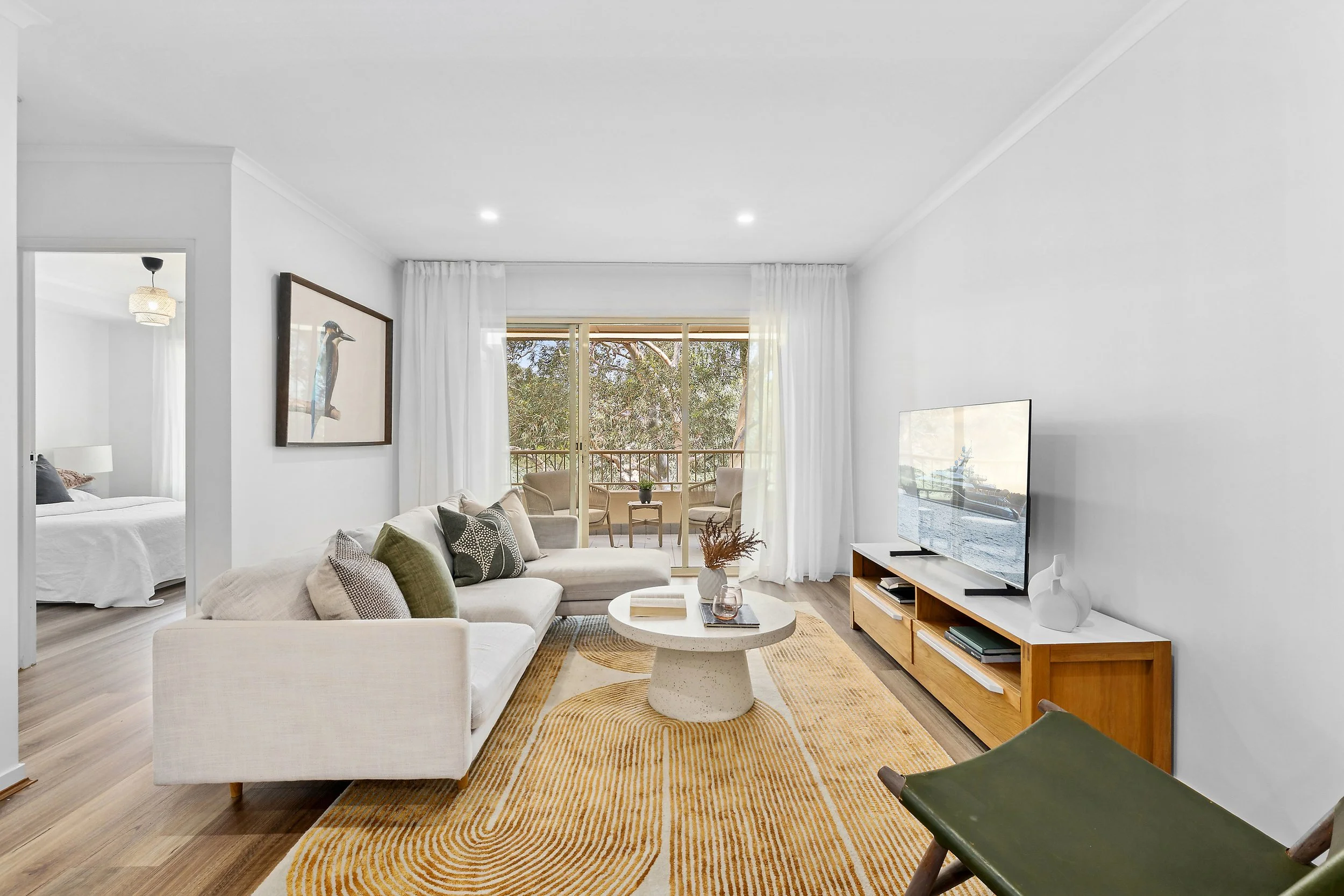 Step inside to open-plan living and dining, finished with engineered oak floors and LED lighting. The kitchen features electric cooking, ample storage and updated floor tiles, while sliding doors lead to a balcony with leafy views over the internal courtyard-complete with extra power points and a built-in clothesline.—
